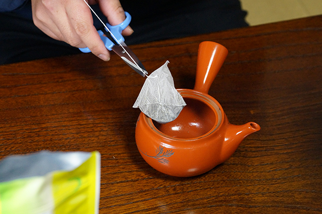 ・そのままの状態で急須に入れていただいても良いですし、「ひも」が気になるようでしたら、写真のように切ってお使いください。